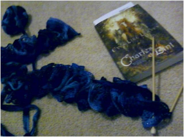 Curly scarf from Boutique Sashay yarn, Eyes Like Leaves by Charles DeLint – current book and current project
